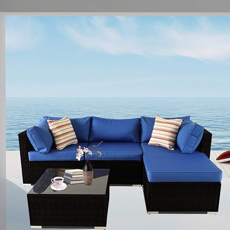 Patio Sofa Furniture Garden Rattan Couch 5pcs Outdoor Sectional Sofa Conversation Set Royal Blue Cushion Black Wicker