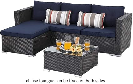 Phi Villa 3 Piece New Patio Sectional Furniture Outdoor Sofa Set With Upgrade Rattan Wicker Navy Blue