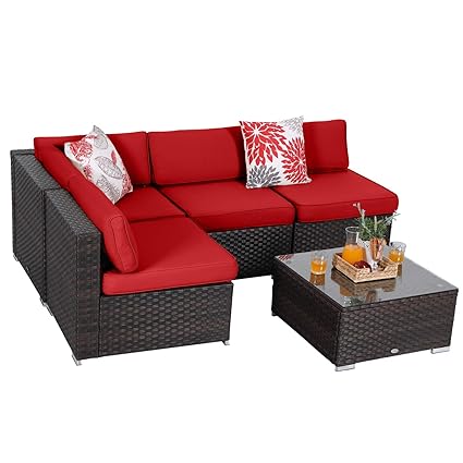 Phi Villa 5 Piece Outdoor Furniture Wicker Patio Sectional Sofa Couch Set With Tea Table Red