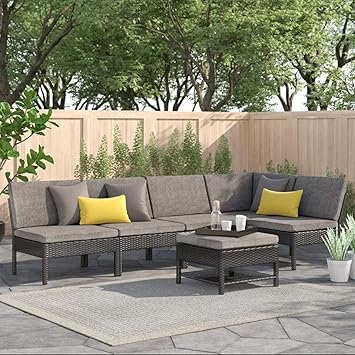 Wisteria Lane 6 Piece Outdoor Furniture Set Modular Wicker Patio Sectional Sofa Couch For Garden Backyard Sophisticated Glass Coffee Table With Fabric