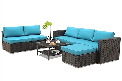 Phi Villa 6 Piece Outdoor Sectional Sofa Rattan Patio Furniture Set Conversation Set With Tea Table Blue