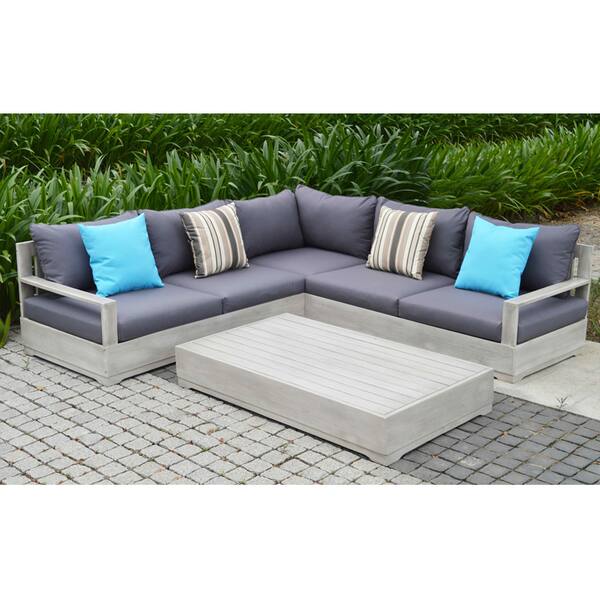 Noble House Brava Grey 4 Piece Wood Outdoor Sectional Set With Dark Grey Cushions