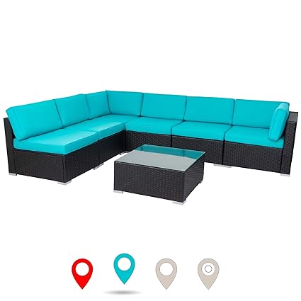 Walsunny 7pcs Outdoor Black Rattan Sectional Sofa Patio Wicker Furniture Set Conversation Sets With Tea Table Washable Couch Cushions Blue